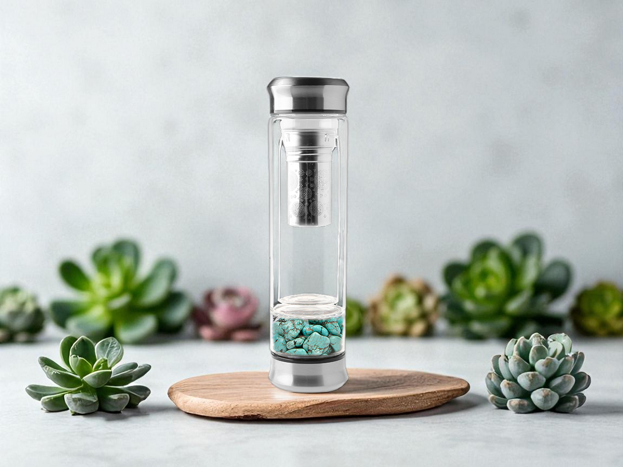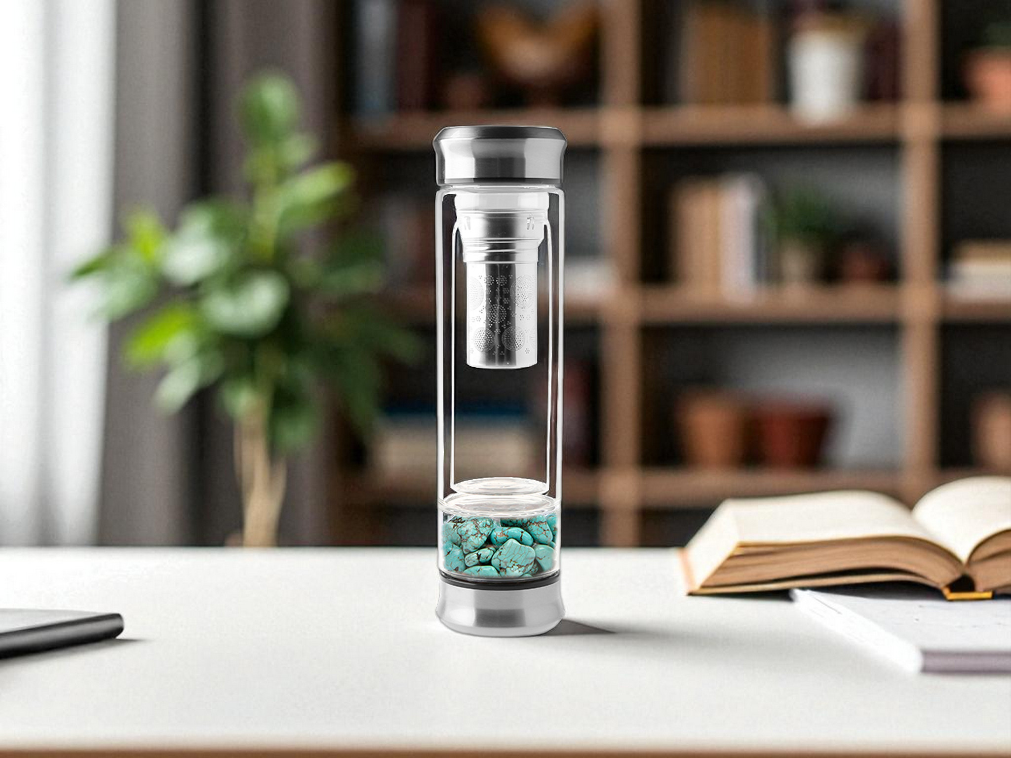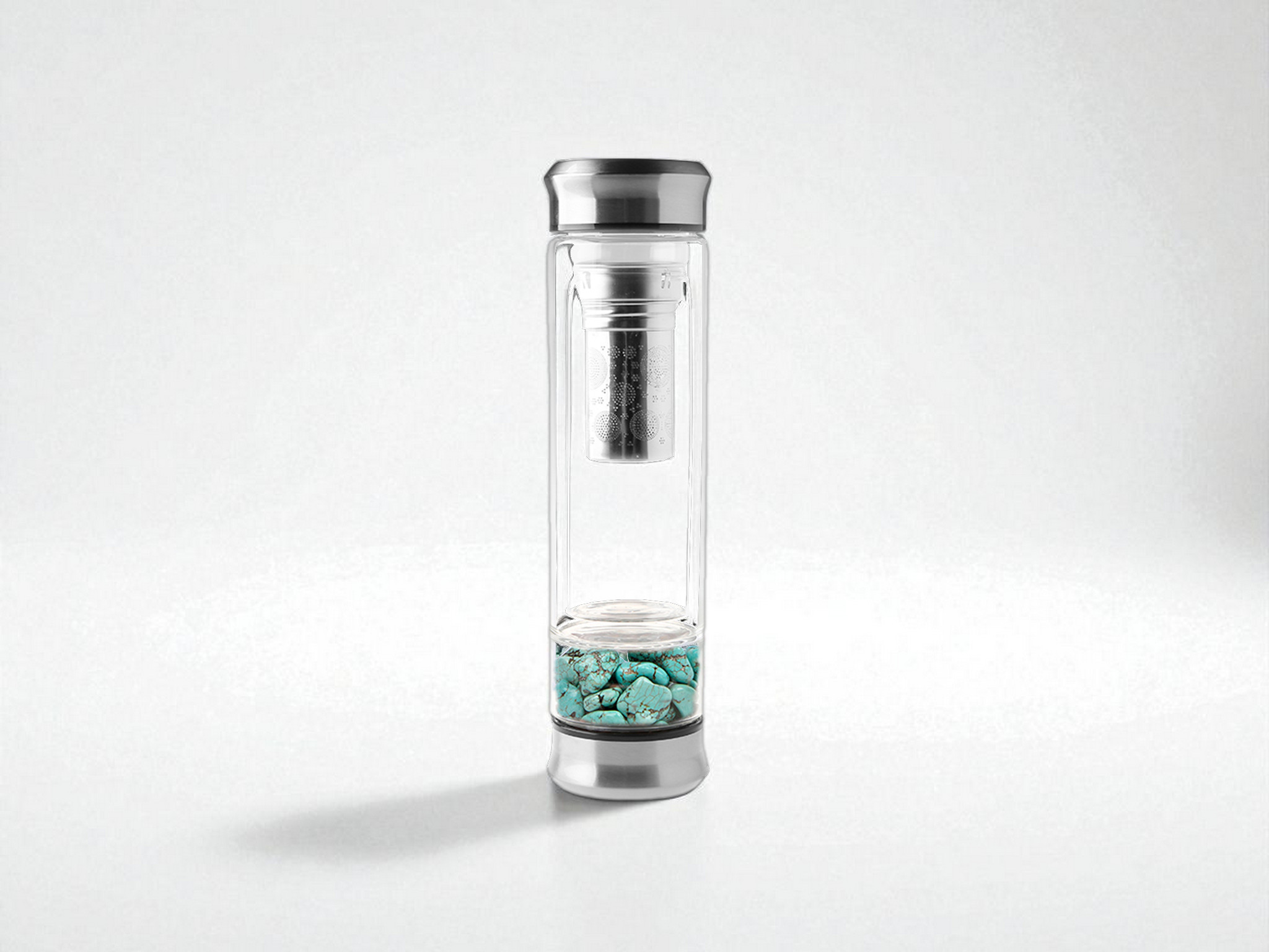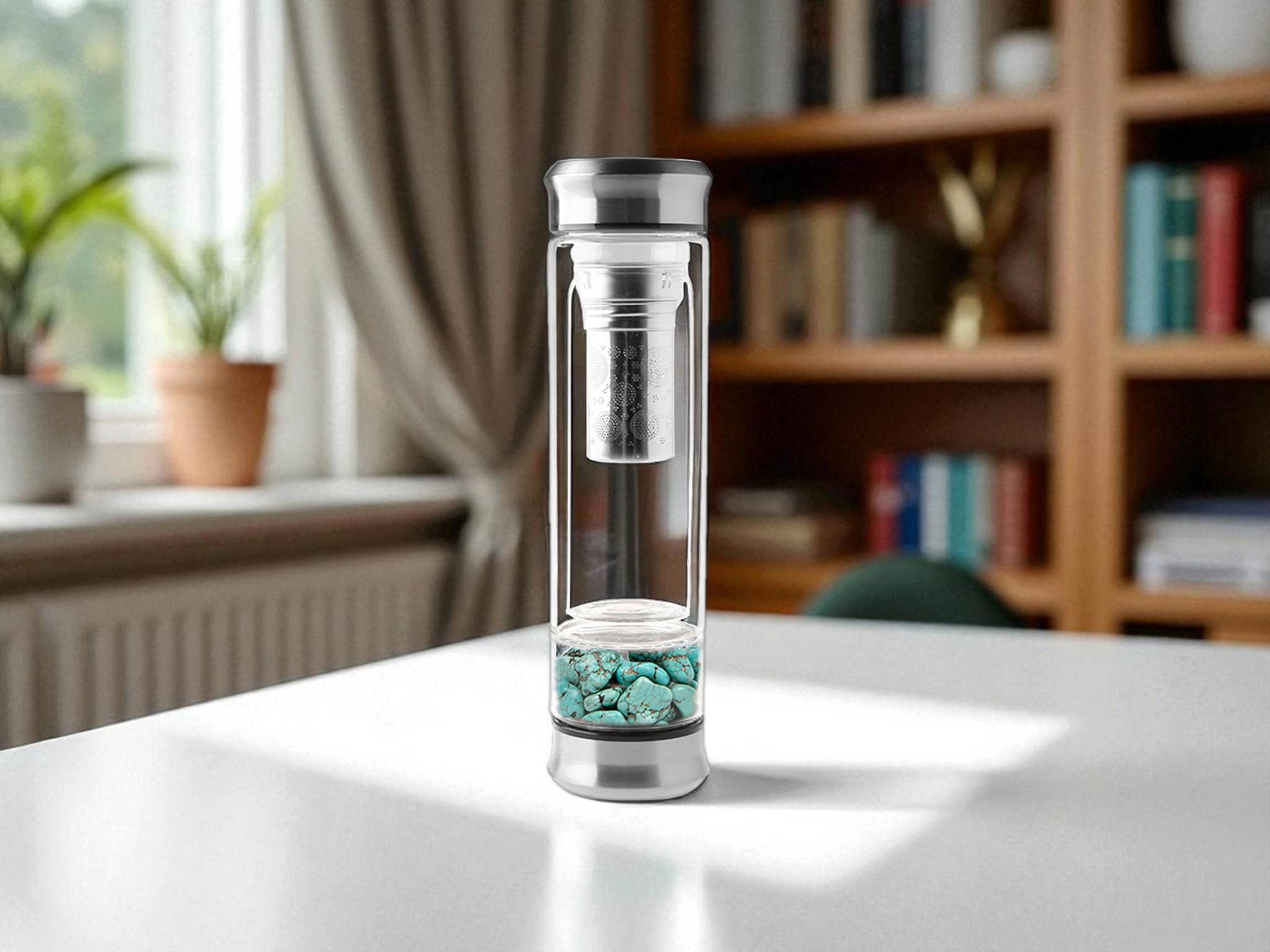 | Beschrijving (vervolgd) | Natuurstenen Turquoise (kiezelstenen) RVS afwerking Dubbelwandig Met theefilter |